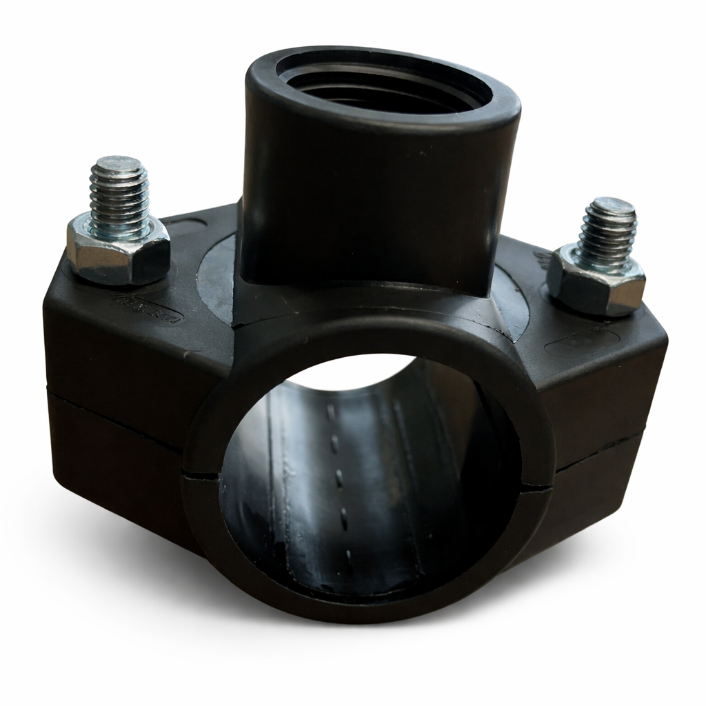 A megfúrós idomok, béklyók vagy nyeregcsatlakozók két félkör metszetű elemből állnak, és a cső palástján helyezhetők el.